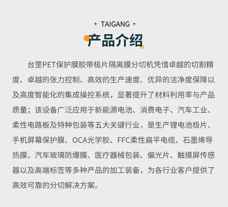 台罡PET保护膜胶带极片隔离膜分切机适用于BOPP、PET、CPP、PVC、铝箔、隔膜、纸张等各种料卷分切。