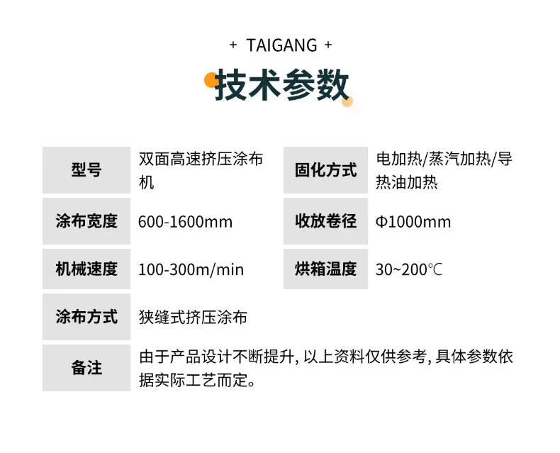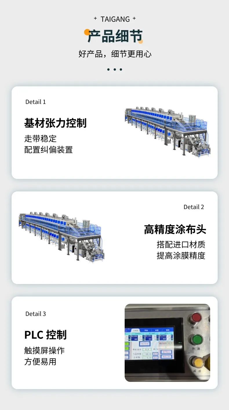 台罡双面高速挤压涂布机适用于锂电池极片、太阳能电池电极和封装材料、光学薄膜等功能性薄膜等领域的涂布加工。
