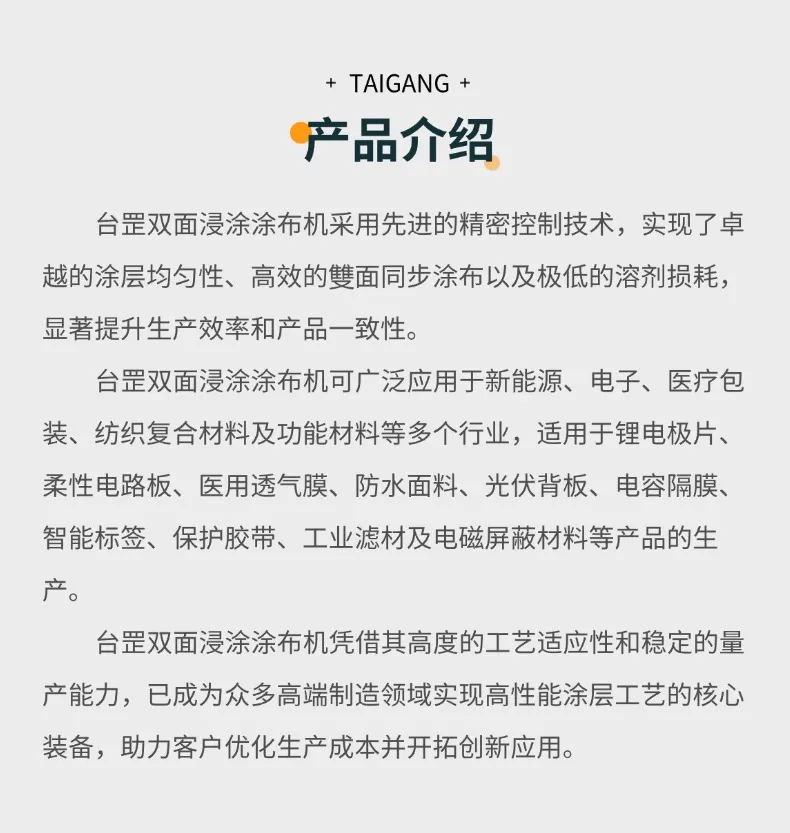 台罡双面浸涂涂布机应用于锂离子电池、锌电池、石墨烯薄膜、玻璃纤维布、正负极拉浆机、陶瓷薄膜、高端胶。