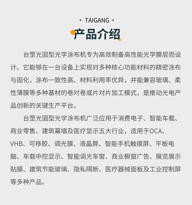 台罡多功能涂布机适用于OCA光学胶、VHB双面胶、可移胶、调光膜、液晶屏、量子点膜等光学材料涂布。
