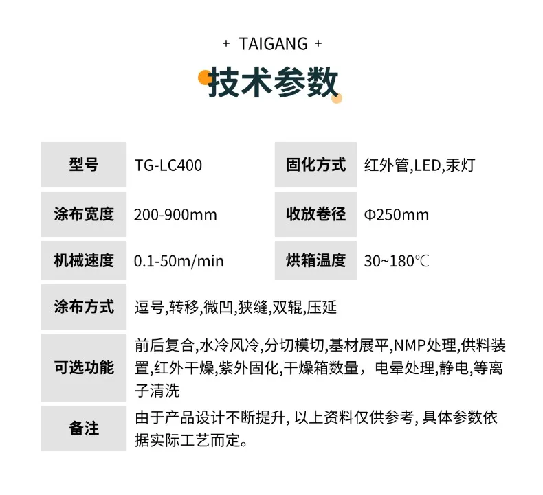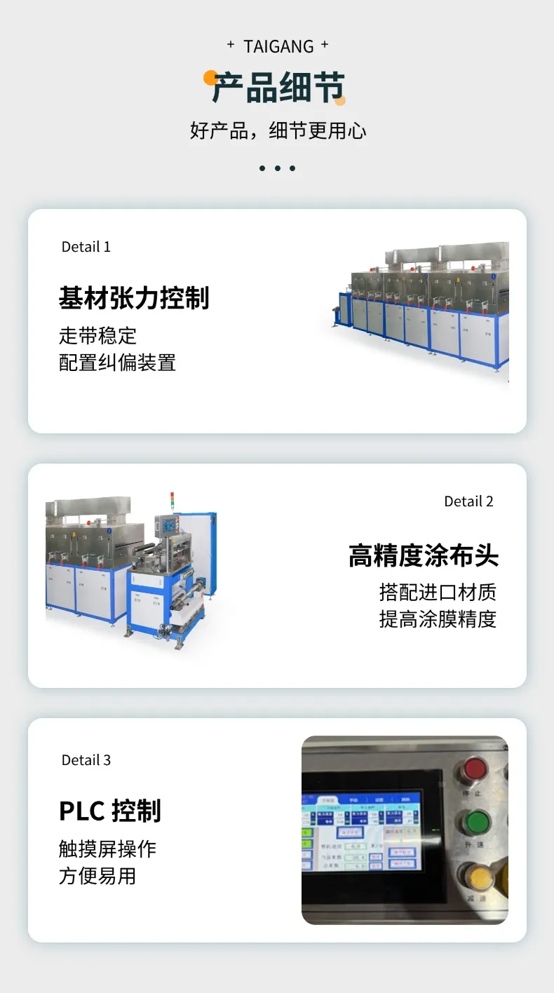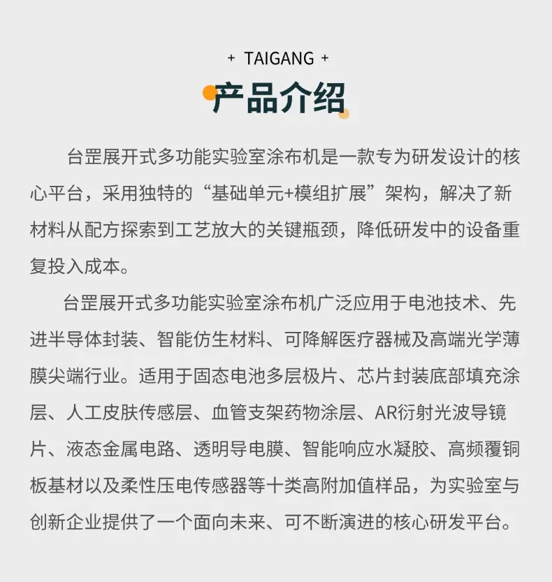 台罡展开式实验室涂布机机头模块化结构,可实现连续涂布、间歇涂布、条纹涂布、网格涂布以及超薄涂层涂布等多种涂布工艺。主要应用于锂离子、锌离子、钠、固态、氢燃料、钙钛矿电池和各类薄膜、纸张、金属箔材的精密涂布