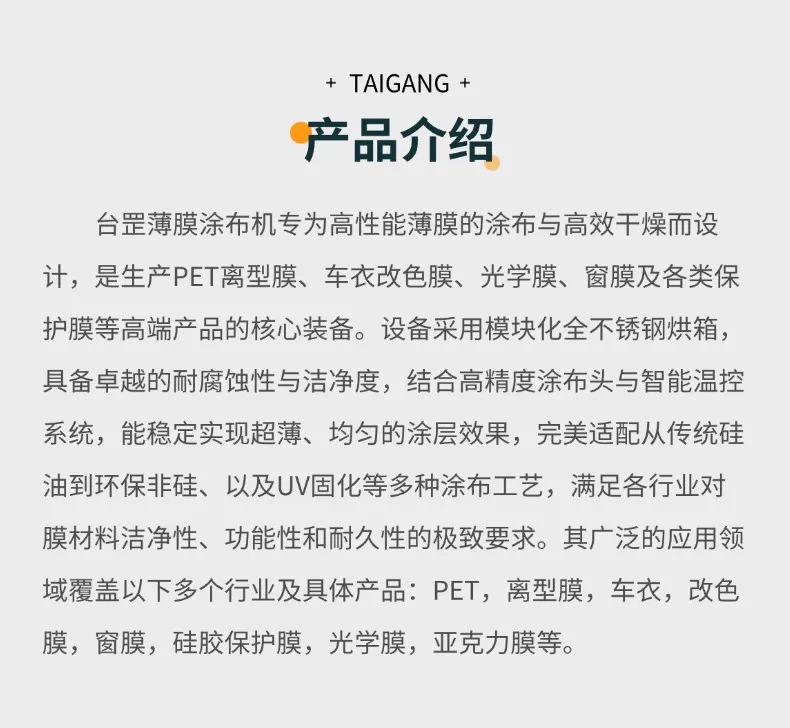 台罡多功能涂布机适用于pet保护膜、离型膜、TPU隐形车衣、改色膜、隔热膜、窗膜、扩散膜、建筑装饰膜的生产。