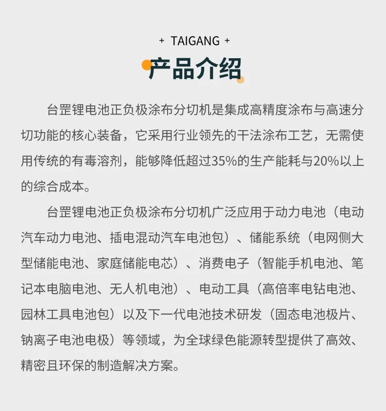 锂电池正负极涂布分切机涂布机是专为锂电池生产设计的设备,用于在电池的正负极片上均匀涂布活性材料。这款机器能够处理连续的电极箔,通过精确控制涂层厚度和宽度,满足不同规格电池的生产需求。它适用于大规模生产线,帮助制造商提高生产效率,同时保持产品的一致性。